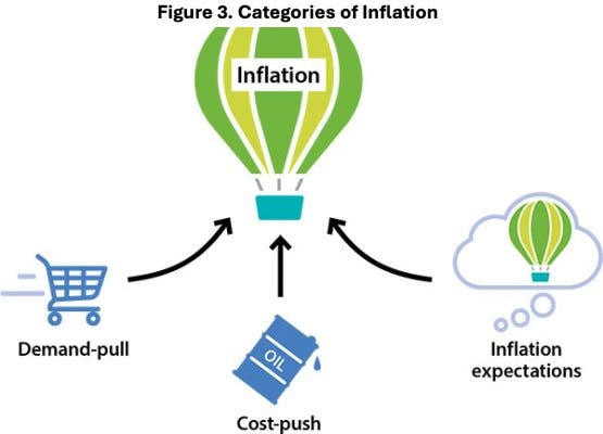 First, there’s a demand-pull, where the demand for goods and services is greater than the supply, which occurs when people’s capacity to pay for things increases, usually in the form of higher wages.