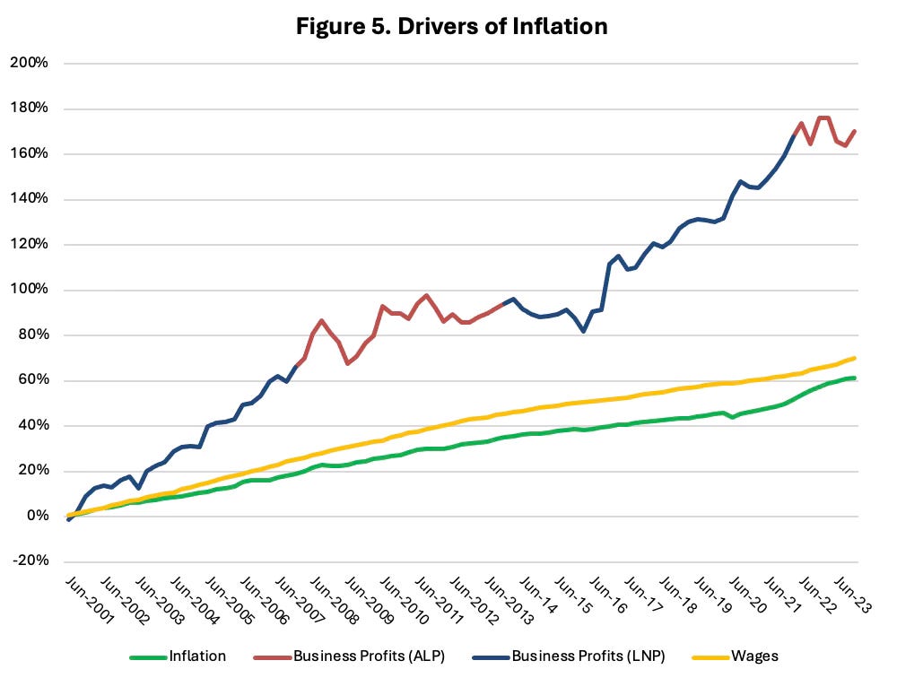 I’ve highlighted the graph to show the political difference in profits. When Labor are in power, profits start to moderate and grow at a similar rate to wages, but when the Coalition enter office, profits become supercharged.