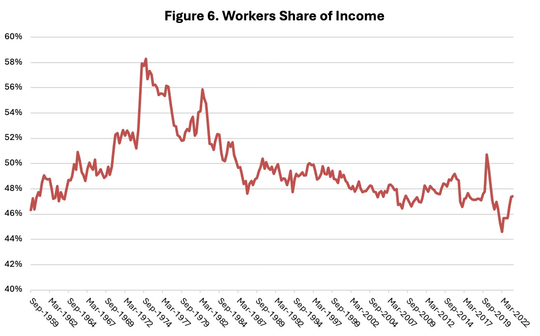 Indeed, we can see that while profits have grown considerably, the 'share of the pie' that workers are getting has fallen substantially, and by this measure workers today are no better off than they were in the 1950s.