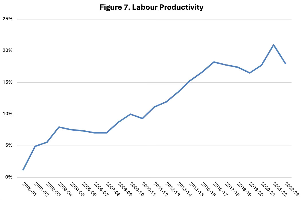 Labour productivity has been growing steadily over the same time period, increasing by 20% over the last 22 years. Workers have held up their end of the bargain and they’ve been burned for it.