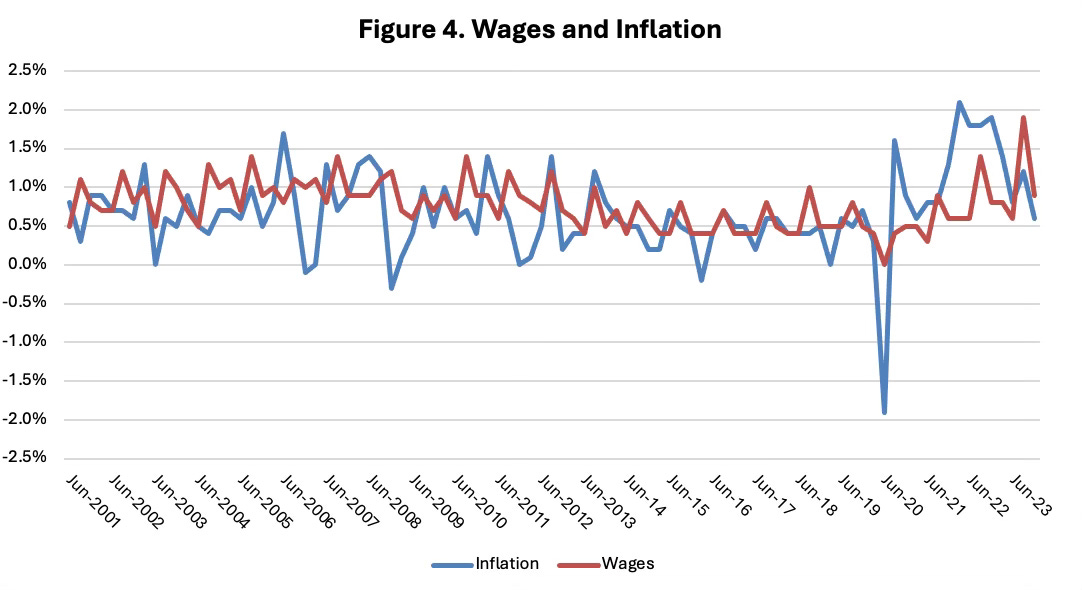 When we look at the relationship between wages and inflation, the picture isn’t so clear cut. They clearly follow each other, and economically they are ‘dependent'; you can’t have inflation without wages.